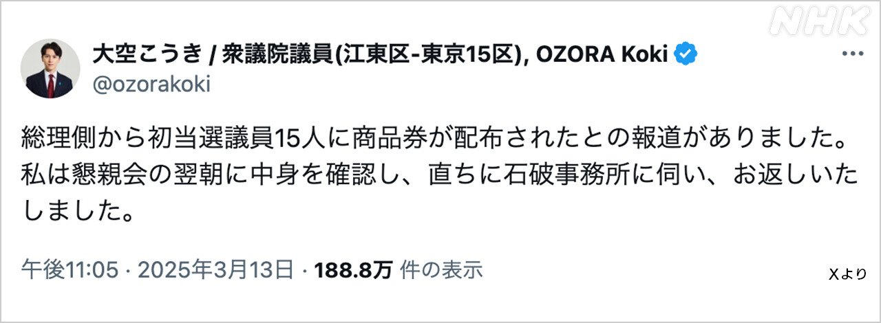 根本拓議員は「事務所に届けられた物の中身が商品券のようだという話を聞き、石破総理大臣と一期生との懇親会の翌日に、開封しないままお返しした」としています。