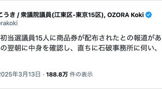 このうち、大空幸星議員は「懇親会の翌朝に中身を確認し、直ちに石破事務所に伺いお返しした。地元を含め日頃応援していただいている方から多数のお問い合わせがあり、事実関係を説明した」としています。