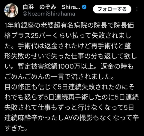 【悲報】有名セクシー女優さん、整形手術に大失敗して撮影不能に (※画像あり) Twitter Facebook はてブ LINE コピー 2025.03.16 スポンサーリンク 1:それでも動く名無し:2025/03/16(日) 11:04:09.48 ID:c6xE6Bvz0 2:それでも動く名無し:2025/03/16(日) 11:05:18.23 ID:fRKhN2ZN0 老舗って書きたかったんか 3:それでも動く名無し:2025/03/16(日) 11:05:24.11 ID:bpFFvxu00 老婆とは 続きを読む