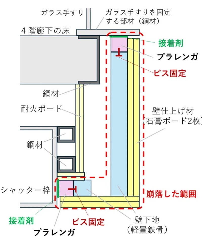 JSCが25年1月に発表した調査報告書によると、崩落した下がり壁は仕上げの石こうボード2枚と壁下地の軽量鉄骨から成る。本来であれば、軽量鉄骨を構造部材に溶接するなどして固定する必要がある。ところがこの建物では、軽量鉄骨にプラスチック製の「プラレンガ」をビス留めし、このプラレンガを4階廊下のガラス手すりを固定する鋼材や、防火シャッターの枠に接着剤で固定。下がり壁の荷重を接着剤のみで負担していた。