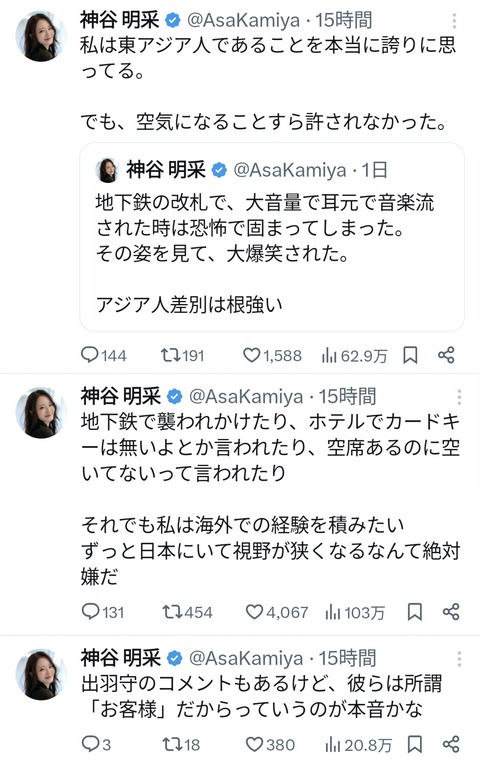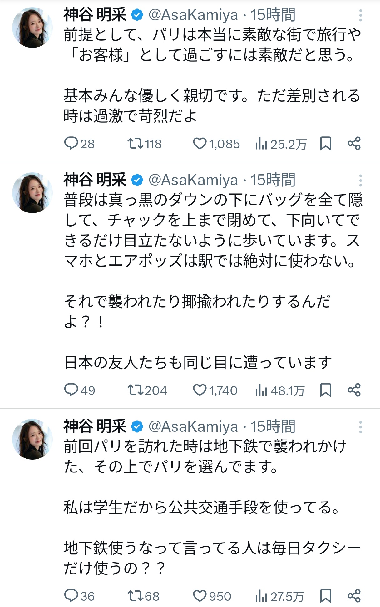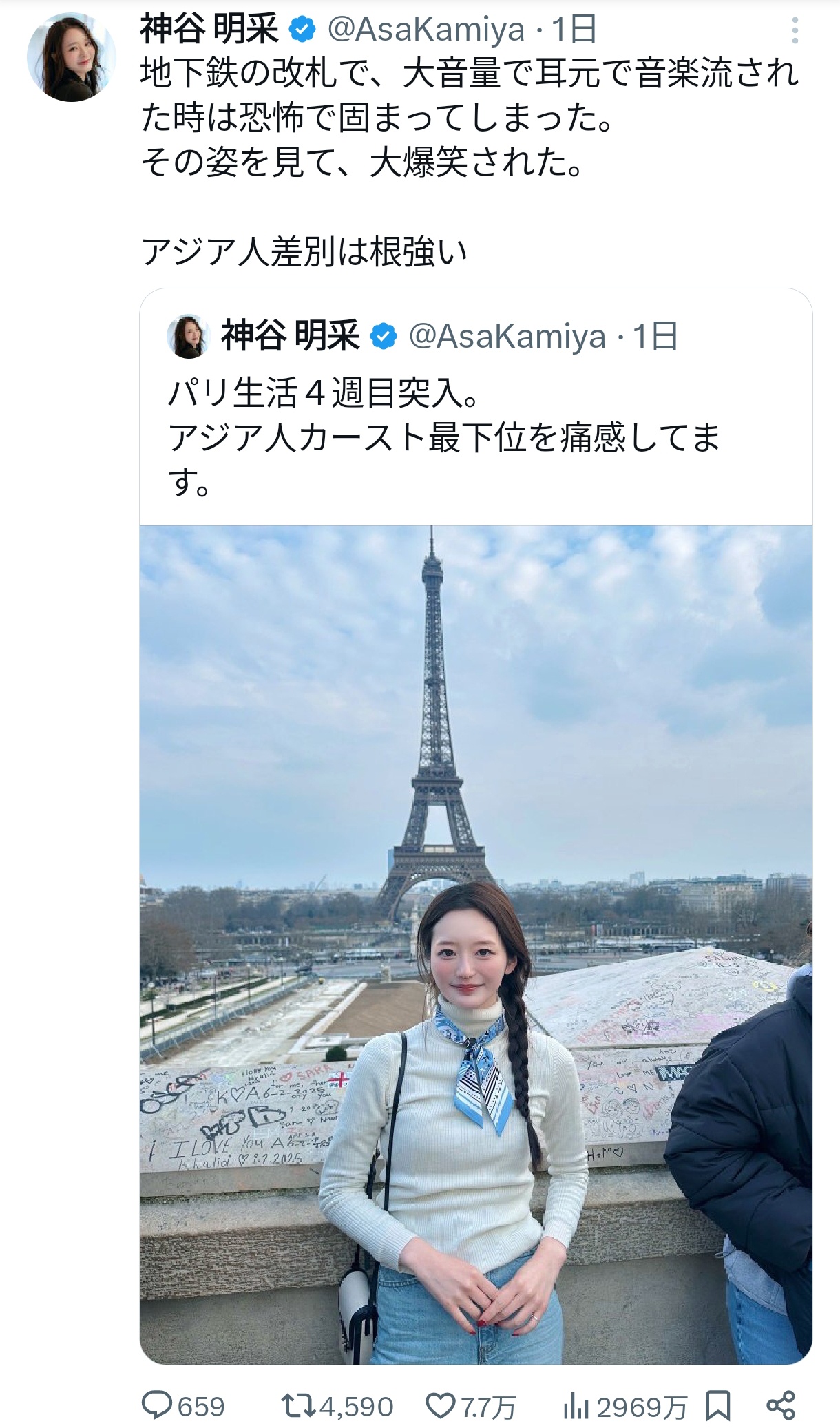 【悲報】ミス東大「パリのアジア人差別は根強い」 Twitter Facebook はてブ LINE コピー 2025.03.19 スポンサーリンク 1:それでも動く名無し:2025/03/19(水) 00:00:33.57 ID:ZAlbv/l90 https://x.com/AsaKamiya 4:それでも動く名無し:2025/03/19(水) 00:02:59.20 ID:UyW+/isA0 そらそうやろ ヨーロッパの差別は差別しようと差別してるんじゃなくてもう虫扱いをナチュラルでやっとる国や 続きを読む