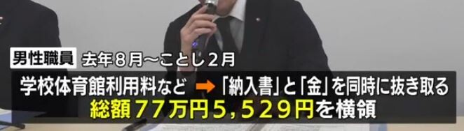 男性職員は、入庁4カ月後の去年8月~今年2月にかけて、市民が課の窓口で支払った市管理の学校体育館の利用料などから、「納入書」とそこに記載された金額分の「金」を同時に抜き取る方法で、総額77万円あまりを横領していたということです。
