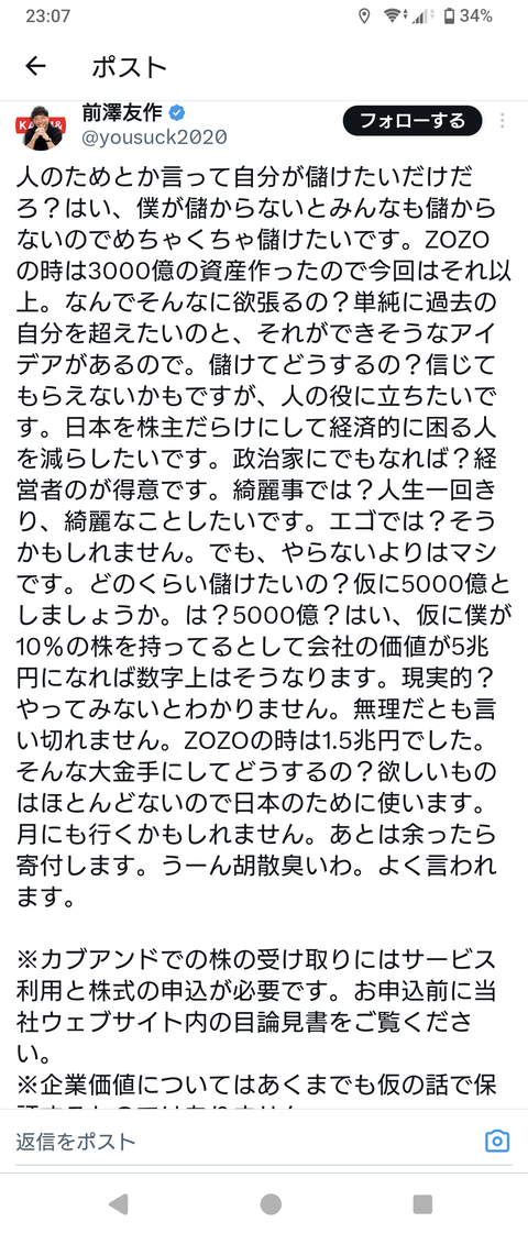 【画像】前澤友作、長文でお気持ち表明wwwwwwwww Twitter Facebook はてブ LINE コピー 2025.03.21 スポンサーリンク 1:それでも動く名無し:2025/03/20(木) 23:08:17.26 ID:Nerom+r30 2:それでも動く名無し:2025/03/20(木) 23:10:53.39 ID:v0lDXvnW0 まあお金配りおじさんはお金配り続けないとダメだよね 4:それでも動く名無し:2025/03/20(木) 23:13:19.81 ID:ZRJNasjh0 勝ち組がSNSで狂っていくの最高やな 5:それでも動く名無し:2025/03/20(木) 23:14:32.20 ID:agBIpeFX0 みんな株主というのがな 続きを読む
