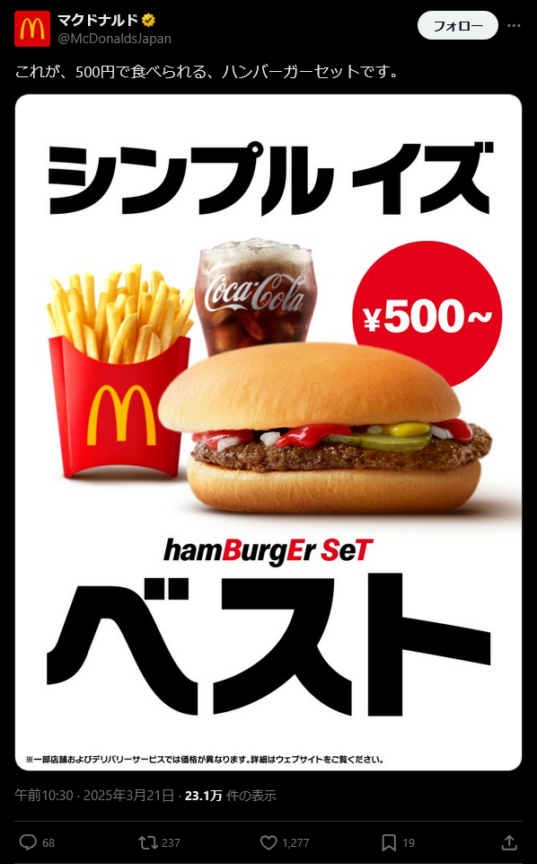 マクドナルド「500円でこんだけ食えるぞ!」 Twitter Facebook はてブ LINE コピー 2025.03.22 スポンサーリンク ◇ 1: 名無し 25/03/21(金) 17:15:49 ID:VHWP https://x.com/McDonaldsJapan/status/1902895437813588224 ◇ 2: 名無し 25/03/21(金) 17:16:00 ID:VHWP うおおおおおおおお😆 ◇ 5: 名無し 25/03/21(金) 17:16:21 ID:uDFO 寂しいもんだな 続きを読む