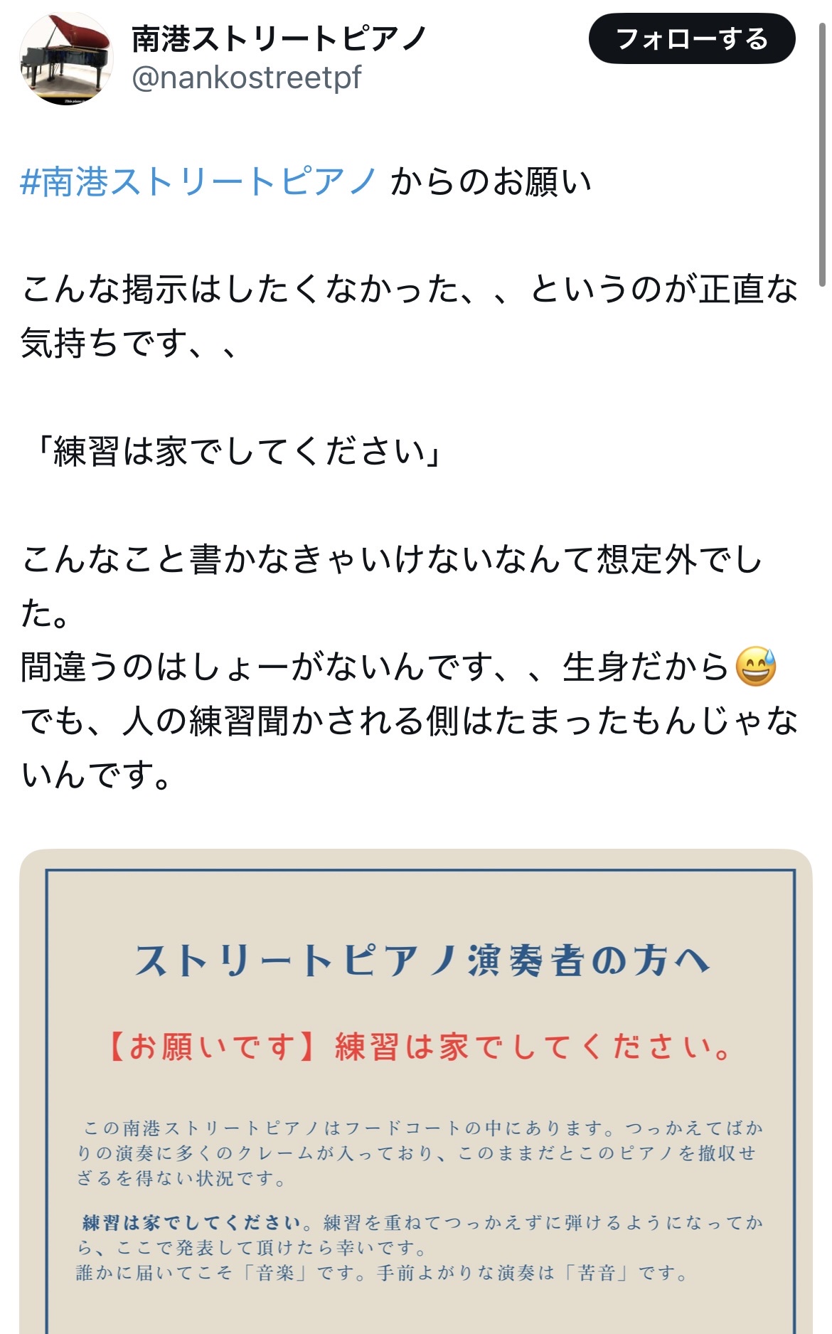 南港ストリートピアノ「練習は家でしてください。つっかえずに弾けるようになってから発表して」 Twitter Facebook はてブ LINE コピー 2025.03.23 スポンサーリンク ◇ 1: 名無し 25/03/23(日) 10:34:26 ID:meHE https://twitter.com/nankostreetpf/status/1903318273589964876 ◇ 6: 名無し 25/03/23(日) 10:36:49 ID:MAwt だったらプロ雇えよ ◇ 7: 名無し 25/03/23(日) 10:36:57 ID:mRrj だったら規制しろよ 続きを読む