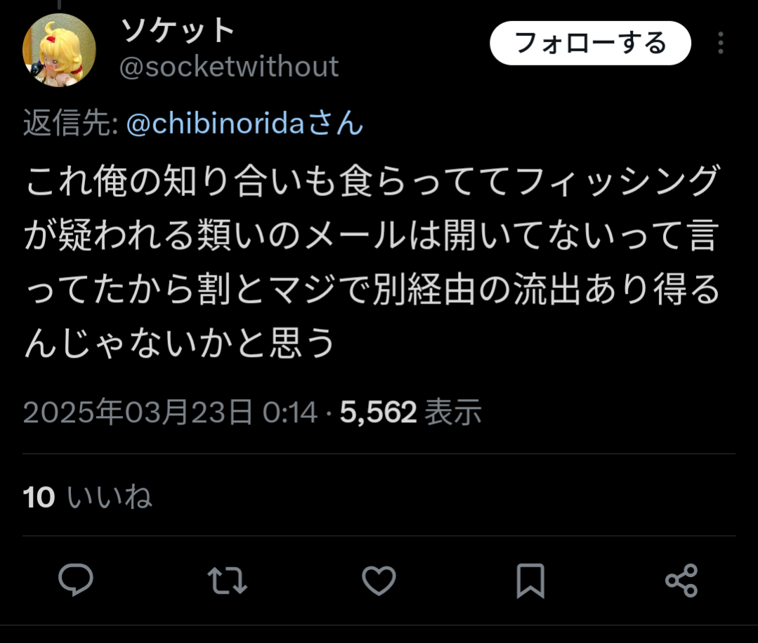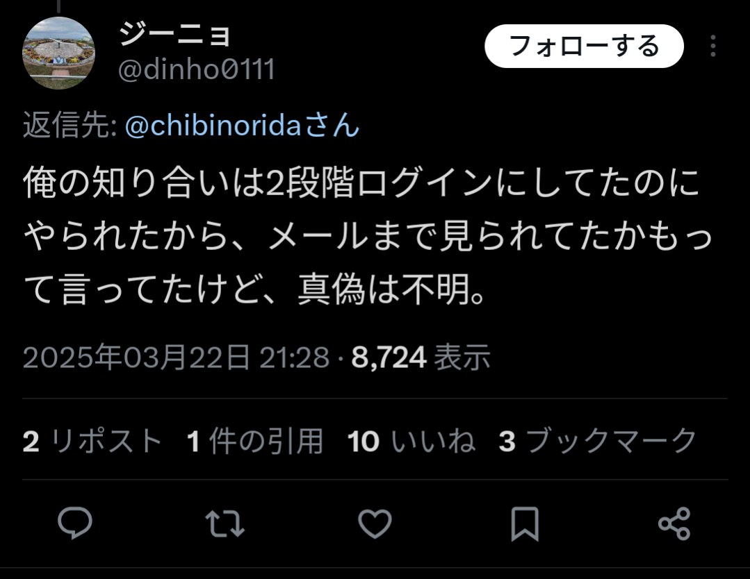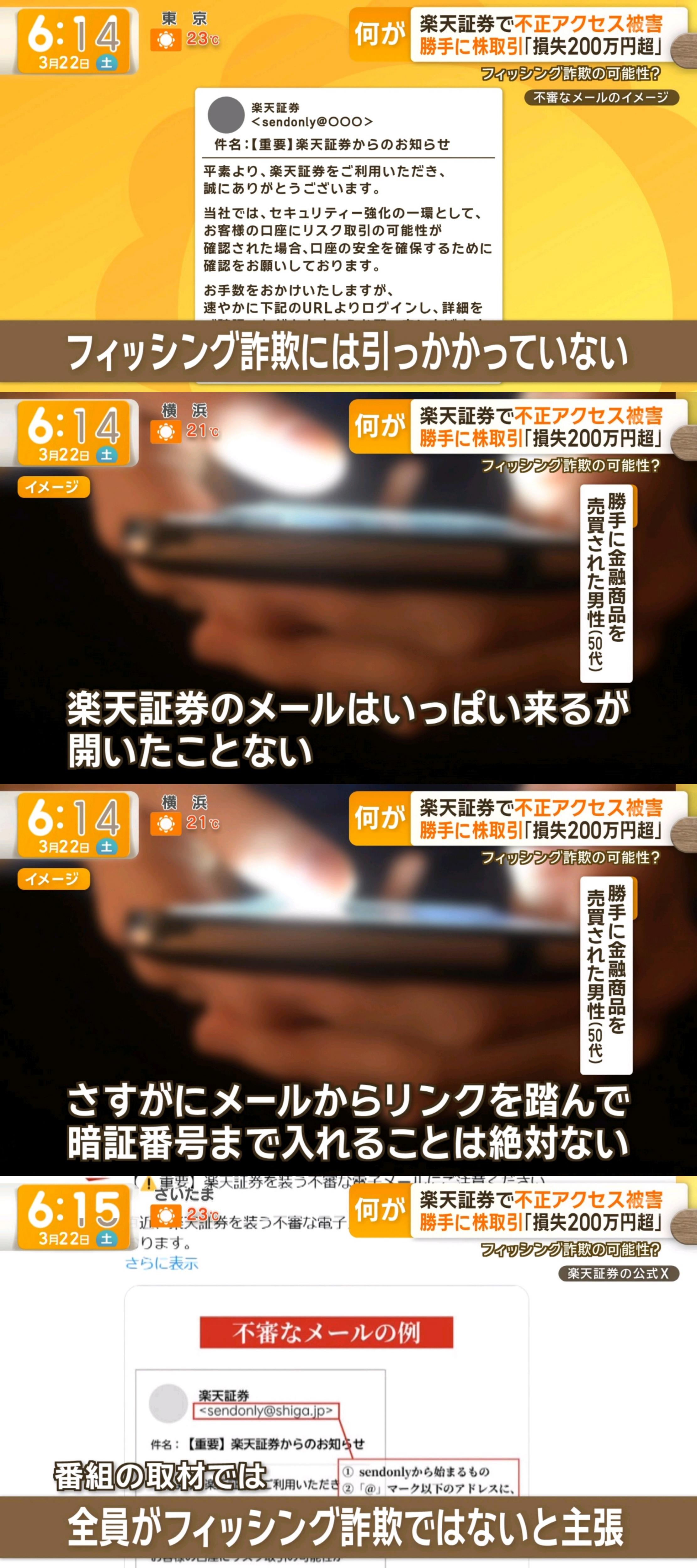楽天口座ハッキング事件がヤバい。ヤバいなんてもんじゃない。超ヤバい。 Twitter Facebook はてブ LINE コピー 2025.03.24 スポンサーリンク 1:令和大日本憂国義勇隊(地図に無い島) [ZA]:2025/03/24(月) 14:46:58.36 ID:I11qCrp00 BE:828293379-PLT(12345) フィッシング詐欺でもない、謎ルートから流出か? http://5ch.net 続きを読む