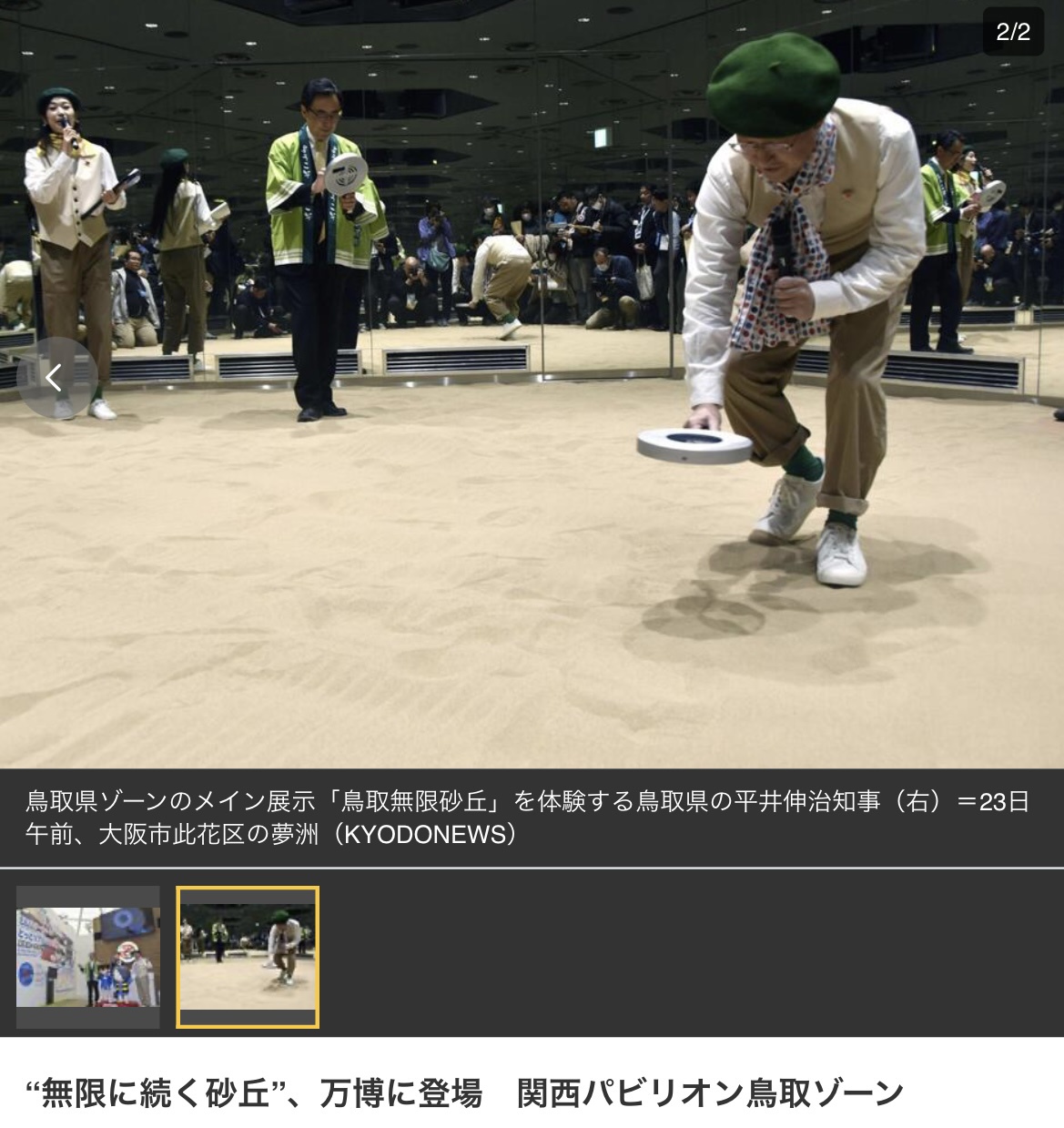 大阪・関西万博で関西広域連合が出展する「関西パビリオン」内の鳥取県ゾーンが23日、お披露目された。鏡で囲まれた六角形の空間に鳥取砂丘の砂を敷き詰めた「鳥取無限砂丘」が展示のメインで、虫眼鏡型の端末で位置情報を読み取ると、県内の名所や特産品が表示される仕組み。