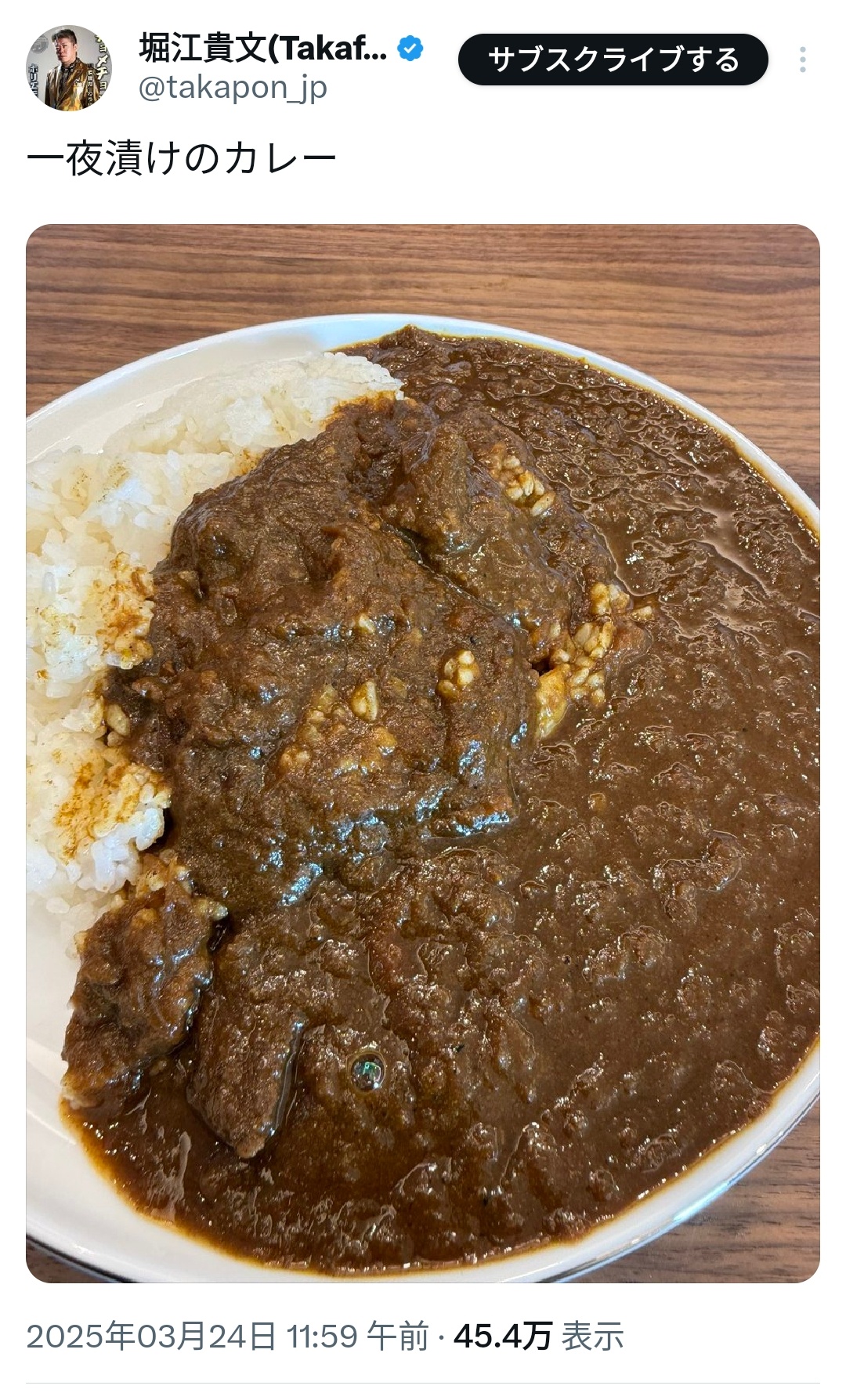 【画像】ホリエモンの手作りカレーがこれ。お前らいくら出せる? Twitter Facebook はてブ LINE コピー 2025.03.25 スポンサーリンク 1:それでも動く名無し:2025/03/25(火) 07:59:22.17 ID:MoKhxGeJd.net 何が入ってるのかは分からない 2:それでも動く名無し:2025/03/25(火) 08:00:12.82 ID:ZP5PR6P50.net 野菜は? 続きを読む