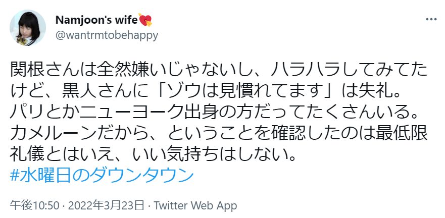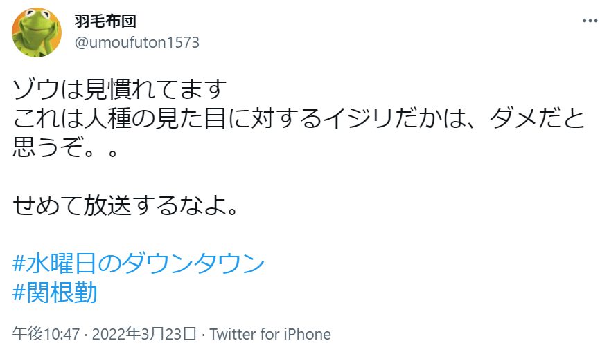 関根勤が水ダウでカメルーン出身の一般人を紹介する際に「ゾウは見慣れてます」と紹介