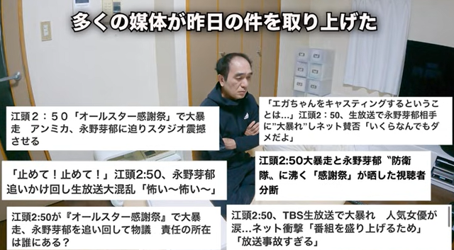 29日放送のTBS「オールスター感謝祭'25春」で女優・永野芽郁をターゲットに〝大暴れ〟した江頭は、共演者に止められる様や、スタッフに羽交い絞めにされるなど、〝暴走ぶり〟が波紋を広げていた。
