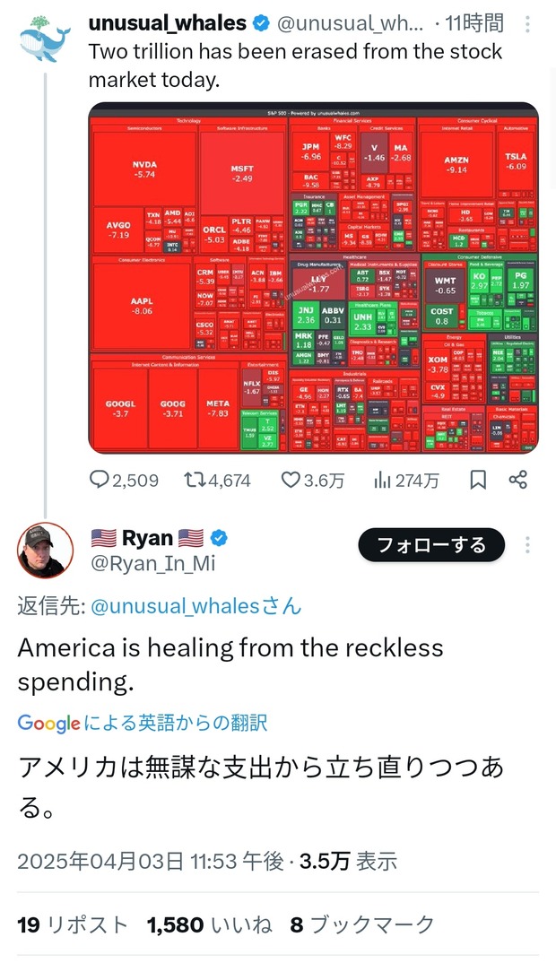 【正論】トランプ支持者「株価急落は効いてる証拠」「投資家は労働者階級から金を奪い続けてきた」 Twitter Facebook はてブ LINE コピー 2025.04.05 スポンサーリンク 1 : 名無しさん@涙目です。 :2025/04/04(金) 22:33:47 ID:aXwxmo360https://x.com/unusual_whales/status/1907808558537646207転載元スレッド:https://hayabusa3.2ch.sc/test/read.cgi/news/1743773627/ 続きを読む