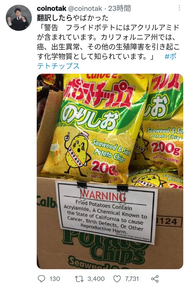 「警告 フライドポテトにはアクリルアミドが含まれています。カリフォルニア州では、癌、出生異常、その他の生殖障害を引き起こす化学物質として知られています。」 #ポテトチップス