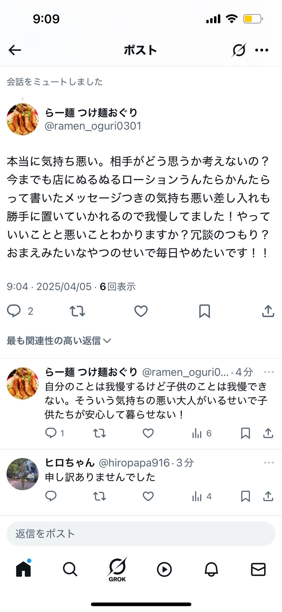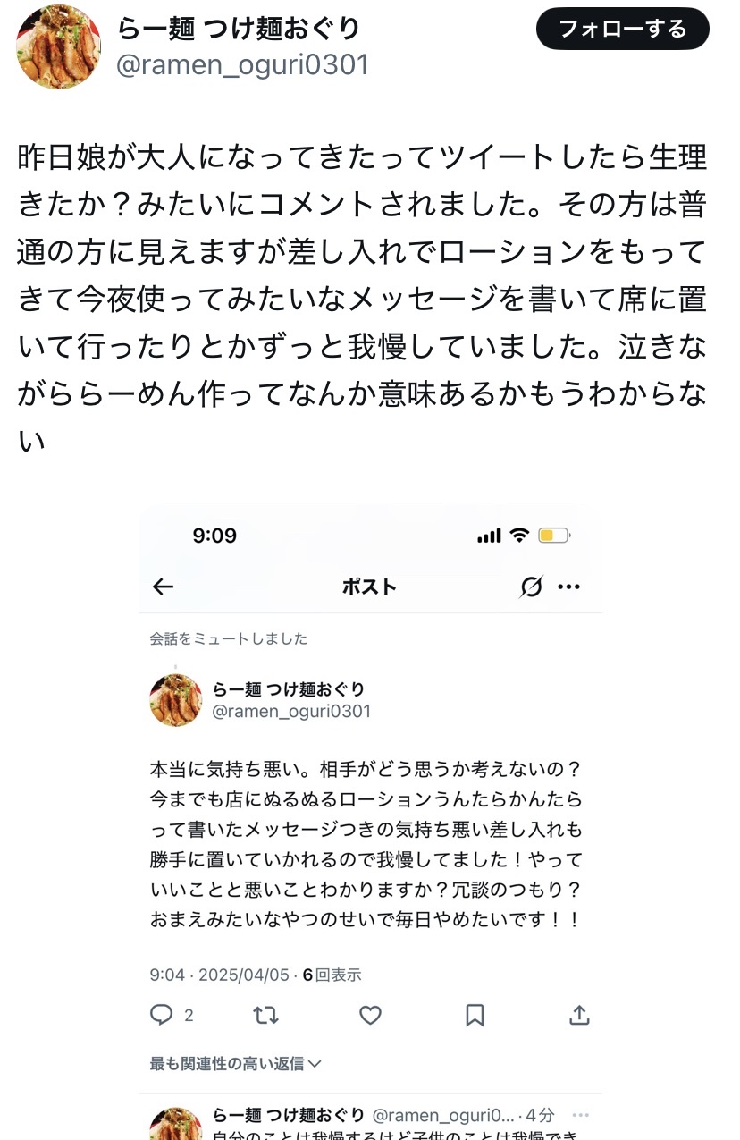 女性ラーメン屋店主、常連客の言動がキモすぎてブチギレ Twitter Facebook はてブ LINE コピー 2025.04.07 スポンサーリンク ◇ 1: 名無し 2025/04/07(月) 00:38:21.76 ID:4UWrUZAB0 その他 https://x.com/ramen_oguri0301/status/1908319633255608334 ◇ 2: 名無し 2025/04/07(月) 00:39:34.24 ID:ALwat9ML0 ヒロちゃん、見損なったゾ… ◇ 5: 名無し 2025/04/07(月) 00:40:37.92 ID:LOpXlGxs0 嫌がられてるのを反応もらったと勘違いしてるんかな 続きを読む