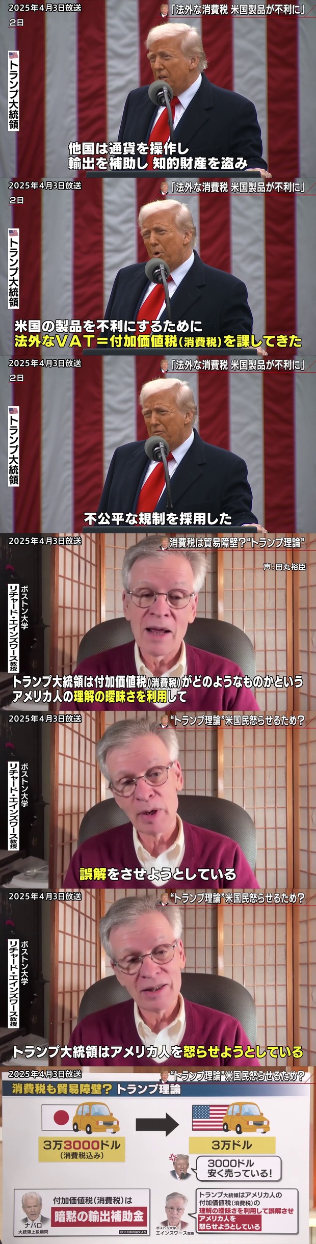 トランプ氏は「付加価値税や消費税も関税と見なす」と語っている。付加価値税や消費税のために、他国の輸出業者はアメリカの輸出業者よりも不当に優位になるという。