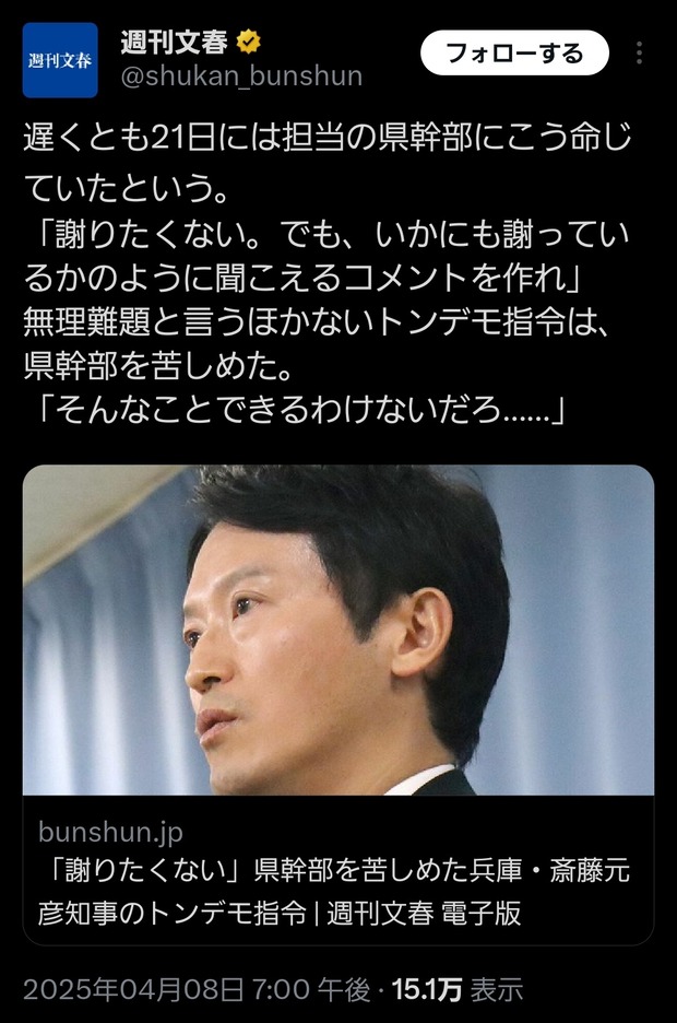 — 週刊文春 (@shukan_bunshun) April 8, 2025