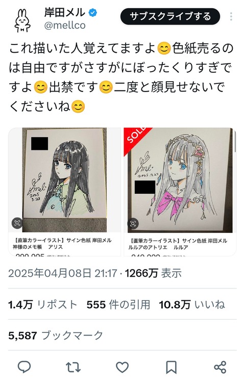 【悲報】岸田メルさん、サイン色紙を転売されてブチギレ出禁宣言wwwwwwwwwww Twitter Facebook はてブ LINE コピー 2025.04.10 スポンサーリンク 1:以下、?ちゃんねるからVIPがお送りします:2025/04/09(水) 14:05:19.606 ID:wgYJflWi0 くさ 2:以下、?ちゃんねるからVIPがお送りします:2025/04/09(水) 14:06:24.978 ID:/Pdb84c/0 さすがにキレるなこれは 3:以下、?ちゃんねるからVIPがお送りします:2025/04/09(水) 14:06:34.609 ID:1xpFN7qT0 岸田メルなんかのサインがこんな値段で売れるのか 続きを読む