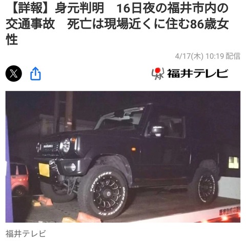16日夜、福井市内の市道で事故があり、道路を歩いていた女性が軽自動車にはねられ、まもなく死亡しました。