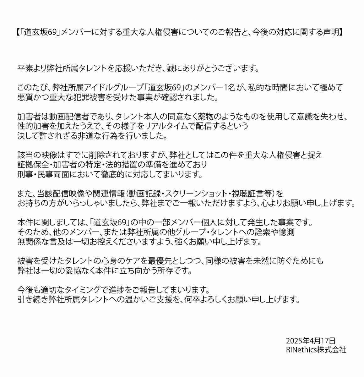 メンバーに対する「重大な人権侵害」が行われる事案が起きたことを報告し、民事・刑事両面で徹底的に対応するなどと表明した。