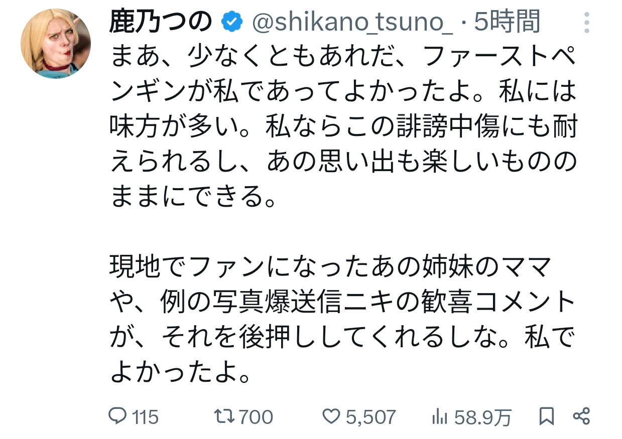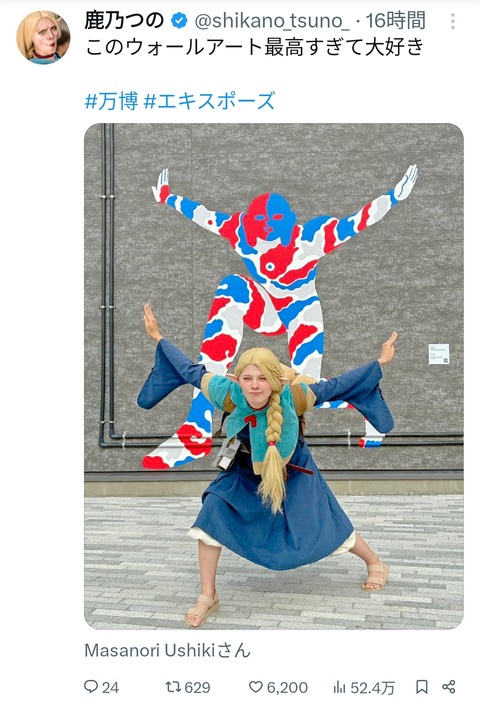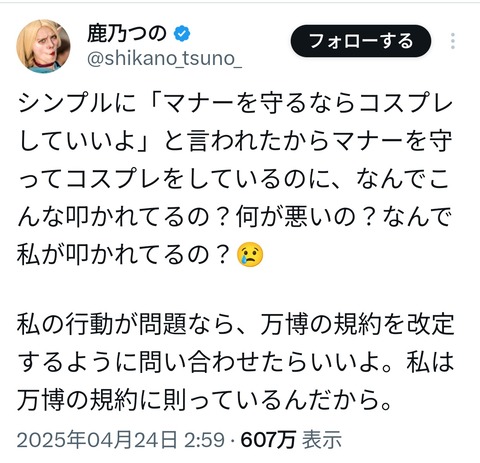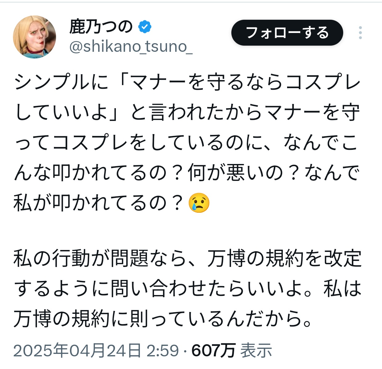 【悲報】大阪万博をコスプレして歩いた人がマナー違反だとして炎上し誹謗中傷が殺到、お気持ち表明へ… (※画像あり) Twitter Facebook はてブ LINE コピー 2025.04.25 スポンサーリンク 1:以下、?ちゃんねるからVIPがお送りします:2025/04/24(木) 15:55:33.916 ID:7Hu1iGRN0 コスプレ禁止じゃないなら別に良くない? ↓ 2:以下、?ちゃんねるからVIPがお送りします:2025/04/24(木) 15:56:55.822 ID:X6+HeTGz0 こんだけ目立てば本人も本望だろ 続きを読む