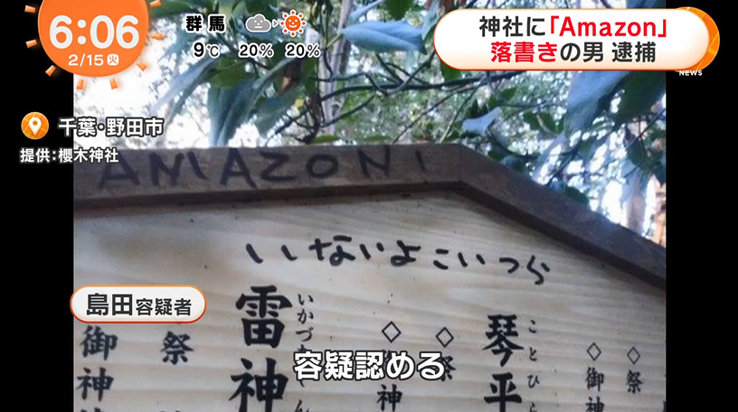 男性は2021年12月、野田市桜台の櫻木神社で、社殿や石碑など13か所に黒の油性マーカーで「Amazon!」などと落書きしたとして、2月、警察に器物損壊の容疑で逮捕されました。