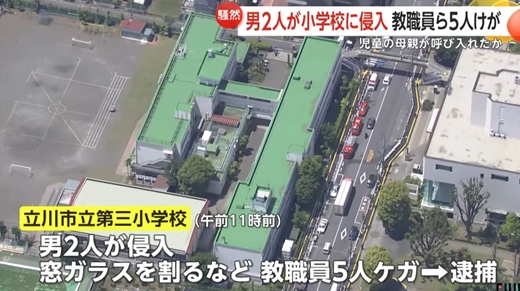 午前11時ごろ、両容疑者は2階の2年生の教室に入った後、1階の職員室に移動しガラスを割った。その際に制止しようとした30~70代の男性教職員5人を殴ったり蹴ったりしたという。児童にけがはなかった。