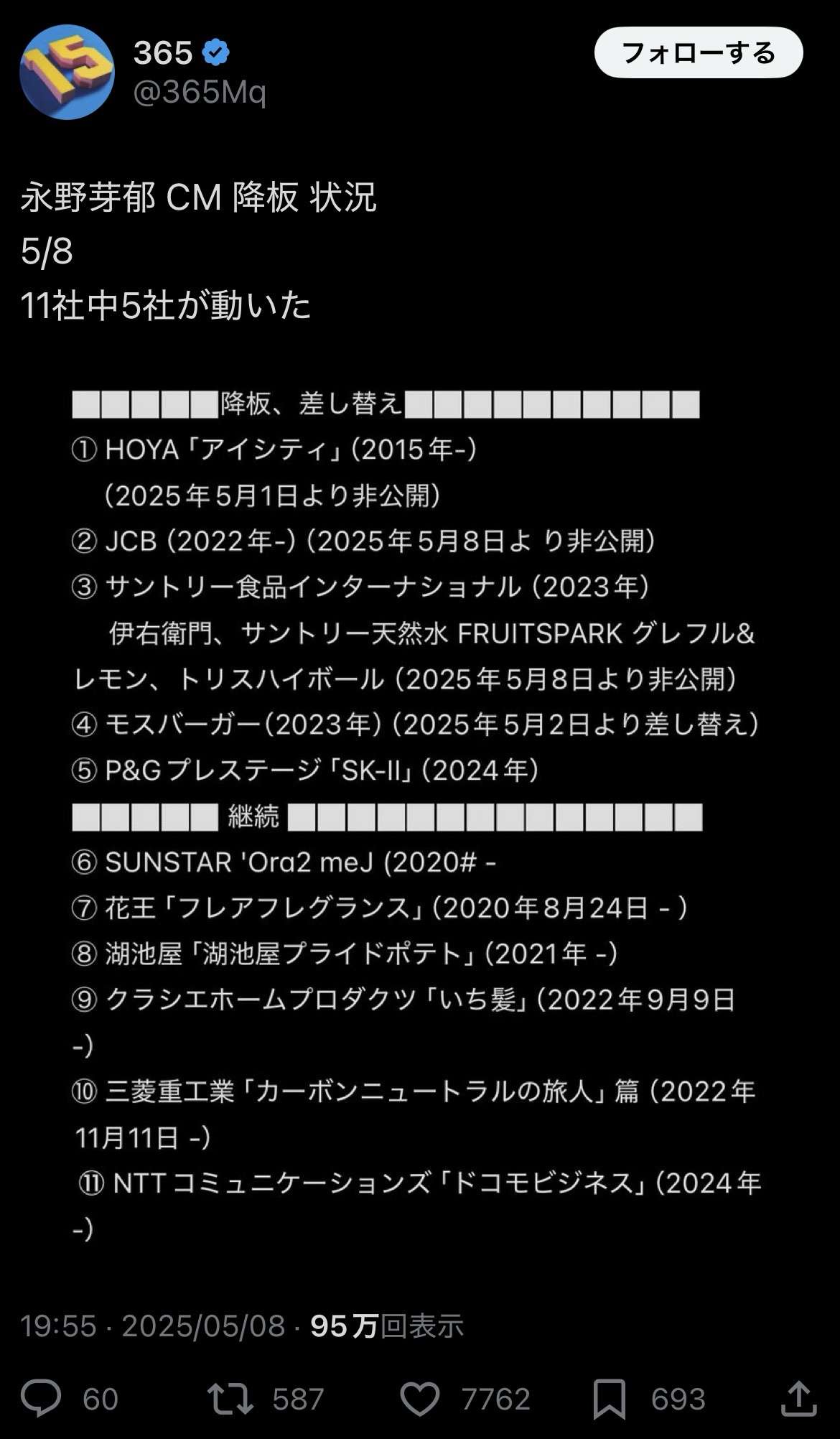 【不倫】永野芽郁さん、CMスポンサー11社中5社が降板wwwwwwwwwwwww Twitter Facebook はてブ LINE コピー 2025.05.10 スポンサーリンク 1:(御前山) [ニダ]:2025/05/09(金) 23:05:41.22 BE:977790669-2BP(2000) 画像 流出LINE https://bunshun.jp/denshiban/articles/b11329 2:レッドインク(茸) [ニダ]:2025/05/09(金) 23:06:02.59 ID:0IVA6NAw0 まぁそうなるわな 続きを読む