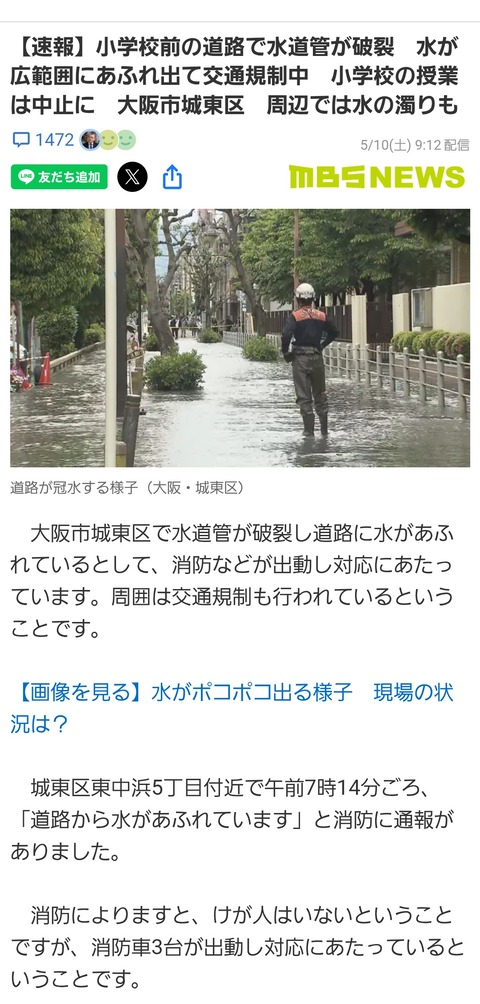 【画像】大阪で水道管が破裂してヤバいことになるwwwwwwwwwwwwwwwwww Twitter Facebook はてブ LINE コピー 2025.05.10 スポンサーリンク 1:以下、?ちゃんねるからVIPがお送りします:2025/05/10(土) 14:44:46.674 ID:5uHE3jQT0 2:以下、?ちゃんねるからVIPがお送りします:2025/05/10(土) 14:45:07.193 ID:5uHE3jQT0 学校の授業も中止 9:以下、?ちゃんねるからVIPがお送りします:2025/05/10(土) 14:48:05.502 ID:FZ/jrQXG0 >>2 土曜に授業があるの? 続きを読む