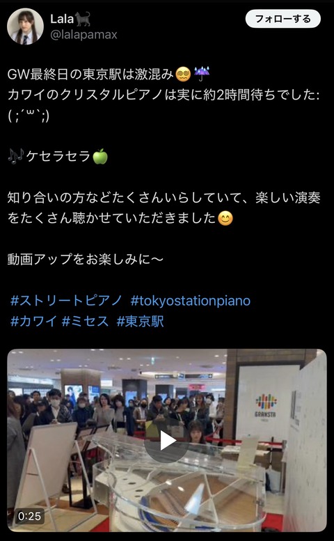 東京駅に設置されたクリスタルピアノ、弾きたい日本人が多すぎて2時間待ちwwwwwwwwwwwww Twitter Facebook はてブ LINE コピー 2025.05.11 スポンサーリンク 1:ときめきメモリアル(茸) [KR]:2025/05/09(金) 17:07:21.35 ID:eU1MmAqf0 BE:271912485-2BP(1500) 3:フライングニールキック(ジパング) [US]:2025/05/09(金) 17:08:00.20 ID:9H0Ik8zt0 もしもピアノが弾けたなら~ 続きを読む