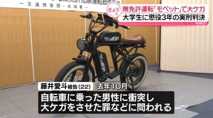 ペダル付き原付バイク「モペット」を無免許で運転し、自転車に乗った男性に衝突し大ケガをさせた罪などに問われた大学生の藤井愛斗被告(22)に対し、東京地裁は21日、懲役3年の実刑判決を言い渡しました。
