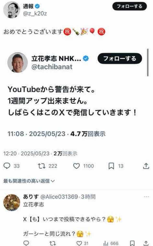 立花氏は「YouTubeから警告が来て。1週間アップ出来ません。しばらくはこのXで発信していきます!」とポスト。
