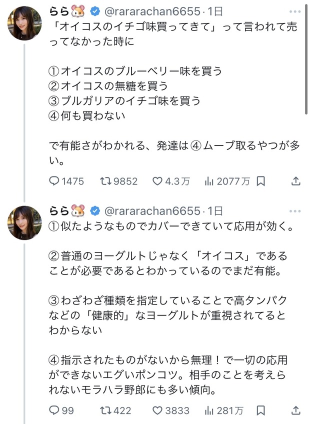 女さん「頼まれた品が無かった時に何も買ってこない奴はハッタショ!」 Twitter Facebook はてブ LINE コピー 2025.05.27 スポンサーリンク 1 : 以下、?ちゃんねるからVIPがお送りします :2025/05/26(月) 15:12:09.383 ID:amSpTIJt0.net①は①でイチゴが良いのに!ってキレそう転載元スレッド:https://viper.2ch.sc/test/read.cgi/news4vip/1748239929/ 続きを読む