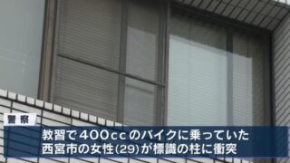 警察によりますと、教習で400ccのバイクに乗っていた西宮市の女性(29)が標識の柱に衝突、女性は病院に搬送されましたが、死亡が確認されました。
