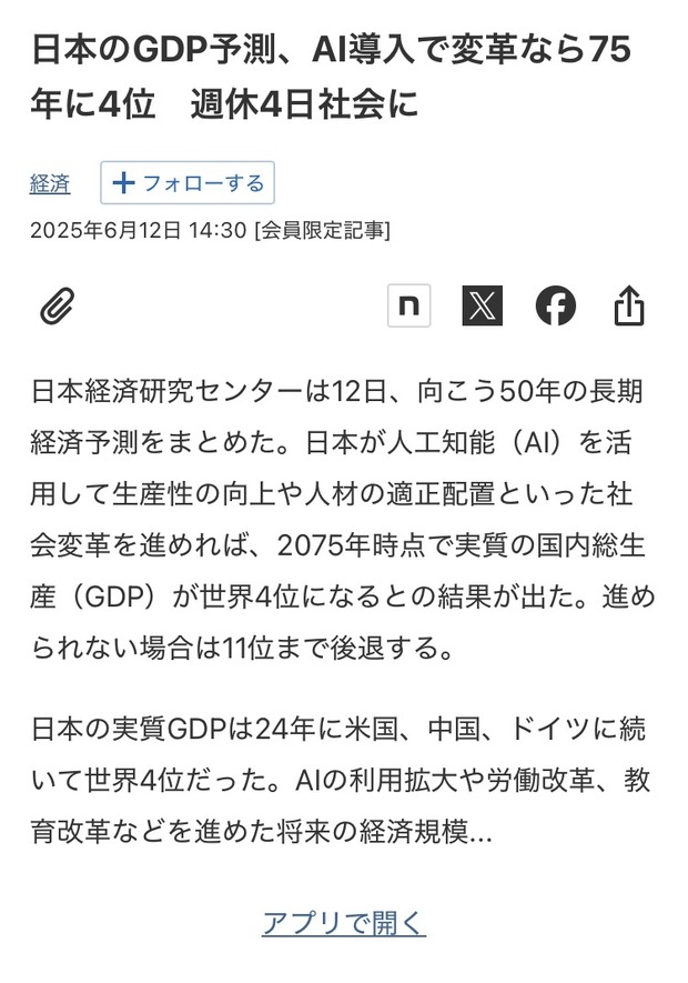日本のGDP予測、AI導入で変革なら75年に4位 週休4日社会に - 日本経済新聞