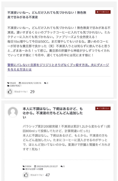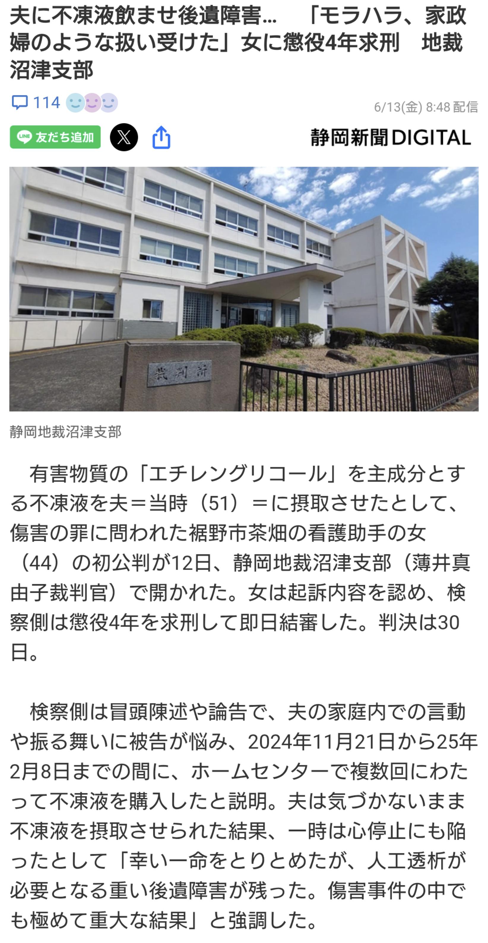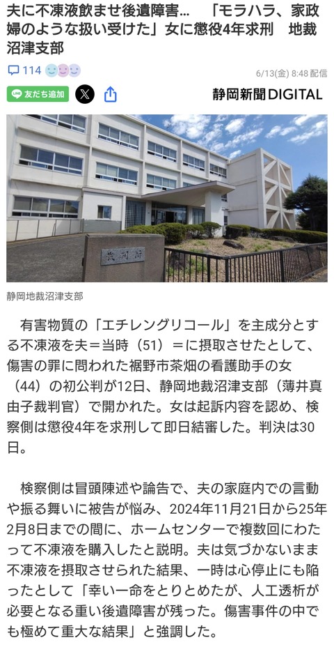 【悲報】女さん、旦那デスノートを実行してしまい逮捕wwwwwwww Twitter Facebook はてブ LINE コピー 2025.06.16 スポンサーリンク 1:それでも動く名無し:2025/06/15(日) 13:47:17.06 ID:o1IIRMON0 不凍液を飲ませたらしい 2:それでも動く名無し:2025/06/15(日) 13:47:56.14 ID:JZfOYsv8d そりゃ病院で詳しく調べたらバレるやろアホなんか 4:それでも動く名無し:2025/06/15(日) 13:49:01.95 ID:SAoDsX6R0 こんだけやって懲役4年 7:それでも動く名無し:2025/06/15(日) 13:49:37.47 ID:8PSVnFrb0 刑期4年ってこのレベルの復讐できるなら真似るやつ増えるだろ 続きを読む
