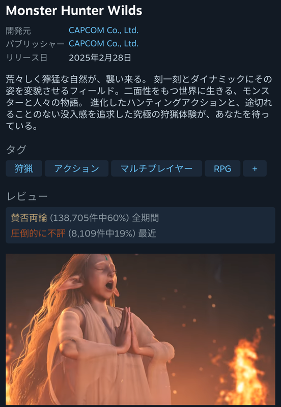 モンハンワイルズ、ついに圧倒的に不評に Twitter Facebook はてブ LINE コピー 2025.06.20 スポンサーリンク ◇ 4: 名無し 2025/06/20(金) 01:11:11.51 ID:z6vCsEHM0 🐔圧倒的不評達成!!🐔 https://store.steampowered.com/app/2246340/Monster_Hunter_Wilds/?l=japanese ◇ 10: 名無し 2025/06/20(金) 01:14:25.37 ID:SrbAn9ca0 株主総会が今日ってこれもう運命だろ ◇ 74: 名無し 2025/06/20(金) 01:22:22.55 ID:jaW0kzQ50 まさかモンハンというタイトルで圧倒的不評をみるとは…感涙ものやわ 続きを読む