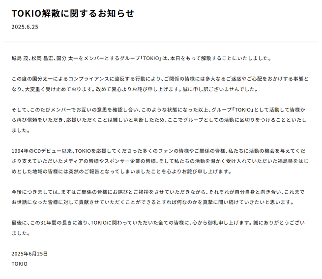 「このような状態になった以上、グループ『TOKIO』として活動して皆様から再び信頼をいただき、応援いただくことは難しいと判断したため、ここでグループとしての活動に区切りをつけることといたしました」と説明した。