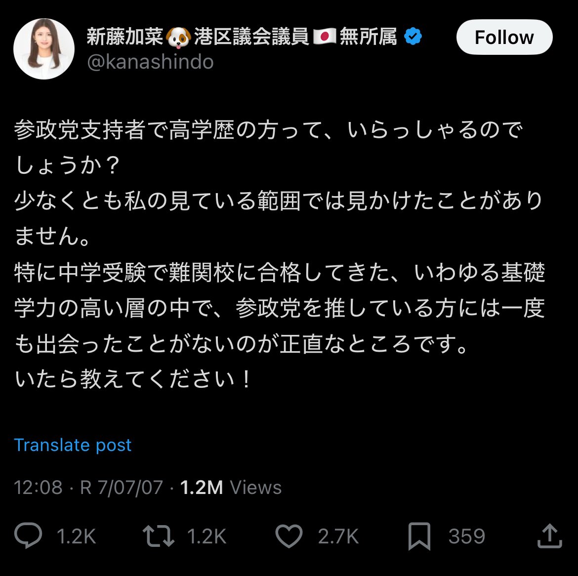 【正論】港区女子「参政党の支持者で高学歴な人間を見たことがない」パシャ Twitter Facebook はてブ LINE コピー 2025.07.08 スポンサーリンク 1:それでも動く名無し:2025/07/08(火) 18:39:45.41 ID:enWU16rR0 一度も出会ったことないらしい↓ 2:それでも動く名無し:2025/07/08(火) 18:39:56.71 ID:enWU16rR0 13:それでも動く名無し:2025/07/08(火) 18:48:55.25 ID:RlLbJ7Jl0 議員としてどうなんや 内容の是非はともかく 14:それでも動く名無し:2025/07/08(火) 18:48:55.61 ID:TdTegHg50 参政党の肩持ちたくないけどこんな選民意識持ってるやつが議員やってんのやばいやろ 続きを読む