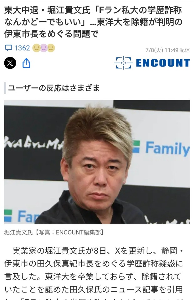 ホリエモンさん、勘違いして炎上 Twitter Facebook はてブ LINE コピー 2025.07.11 スポンサーリンク 1 : 以下、?ちゃんねるからVIPがお送りします :2025/07/10(木) 19:49:51.798 ID:BCTmOAou0.net2 : 以下、?ちゃんねるからVIPがお送りします :2025/07/10(木) 19:50:12.400 ID:BCTmOAou0.net堀江「Fランの学歴詐称なんかどうでもいい」X民「東洋までFランにしないで」堀江「え?Fランじゃないの??」→炎上転載元スレッド:https://viper.2ch.sc/test/read.cgi/news4vip/1752144591/ 続きを読む
