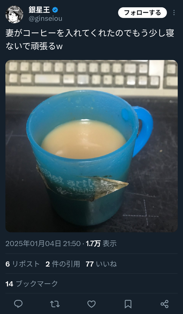【画像】ツイッタラー「妻がコーヒーを入れてくれたのでもう少し寝ないで頑張るw」 Twitter Facebook はてブ LINE コピー 2025.07.17 スポンサーリンク 1 : 以下、?ちゃんねるからVIPがお送りします :2025/07/15(火) 22:09:45.489 ID:PUQ42ZKZ0.net転載元スレッド:https://viper.2ch.sc/test/read.cgi/news4vip/1752584985/ 続きを読む