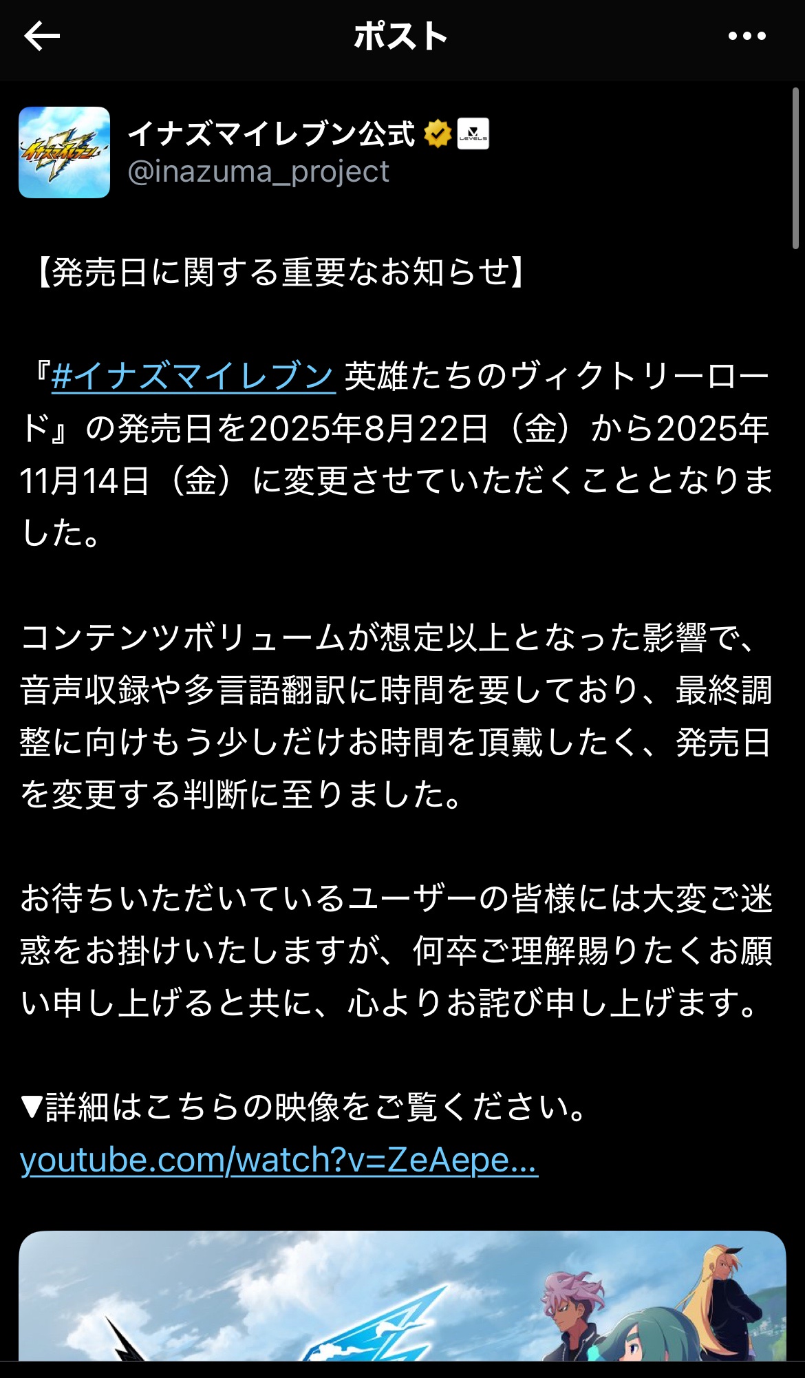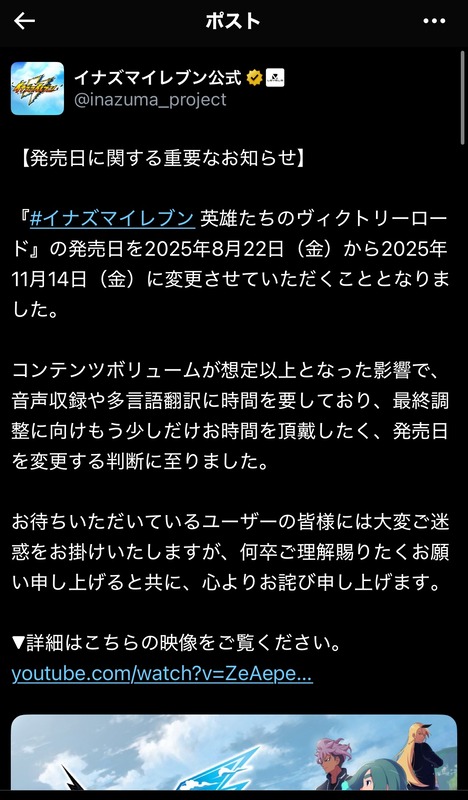 【悲報】イナズマイレブン新作、発売日延期 Twitter Facebook はてブ LINE コピー 2025.07.19 スポンサーリンク ◇ 1: 名無し 2025/07/19(土) 02:01:44.18 ID:EFh22JHm0 8/22→11/14 ◇ 2: 名無し 2025/07/19(土) 02:02:34.29 ID:LXNuM+SU0 知ってた ◇ 4: 名無し 2025/07/19(土) 02:03:24.60 ID:TUowJPWe0 なぜ深夜に発表したんだ 続きを読む