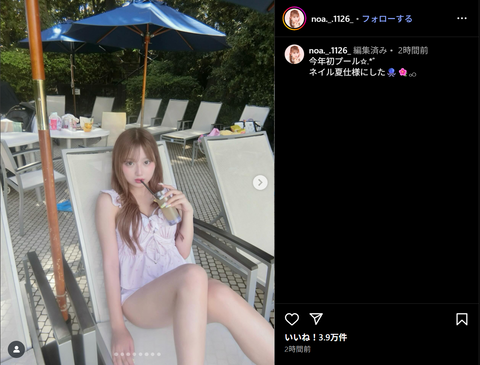 希空は「今年初プール ネイル夏仕様にした」と大量の写真を投稿した。プールサイドミラーの椅子に腰かけ、健康的な足を大胆見せ。さらにはバックショットも投稿している。