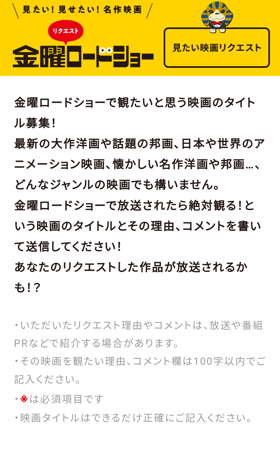 「金曜リクエストロードショー」第5弾実施 本日から募集スタート