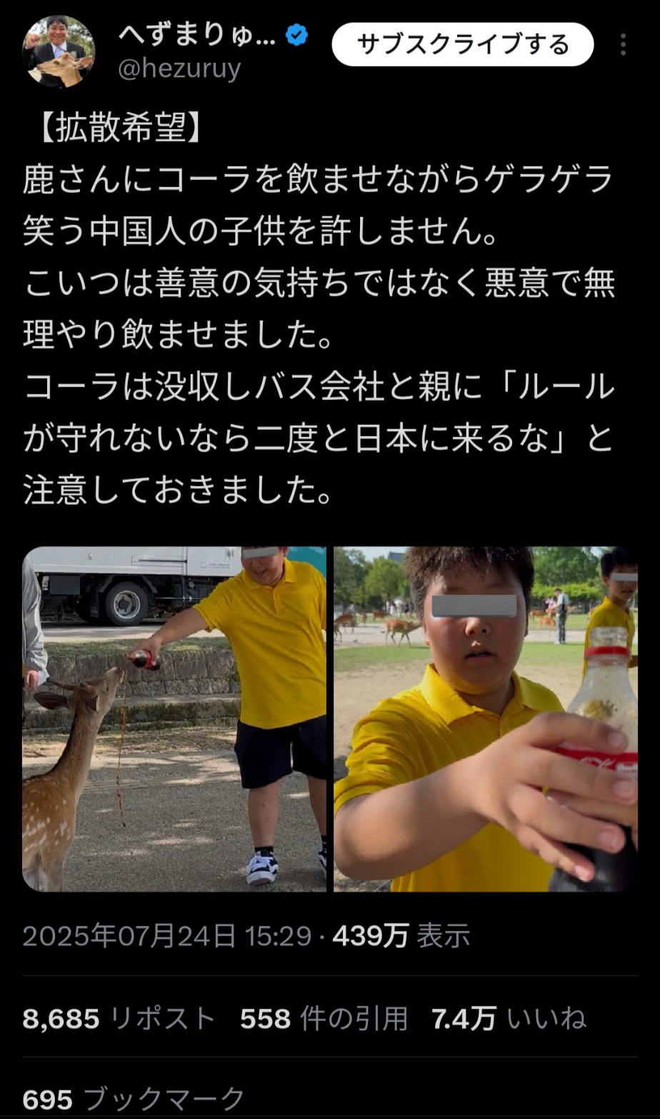 【画像】奈良の鹿にコーラを飲ませた中国人キッズ、へずまがキレるwwwwww Twitter Facebook はてブ LINE コピー 2025.07.24 スポンサーリンク 1:それでも動く名無し:2025/07/24(木) 21:21:58.29 ID:WqYfdeAA0 続きを読む
