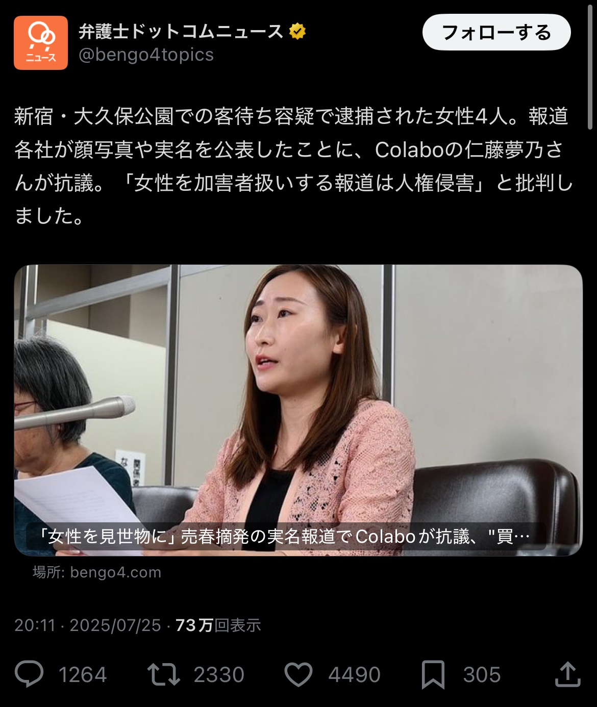 仁藤夢乃さん「立ちんぼ女性を加害者扱いする報道は人権侵害」→全社報道取り下げwwwwwwwww Twitter Facebook はてブ LINE コピー 2025.07.26 スポンサーリンク 1:それでも動く名無し:2025/07/26(土) 14:32:53.69 ID:C0IJrUEa0 2:それでも動く名無し:2025/07/26(土) 14:33:16.54 ID:C0IJrUEa0 被害者なんデスけど!!!! 続きを読む