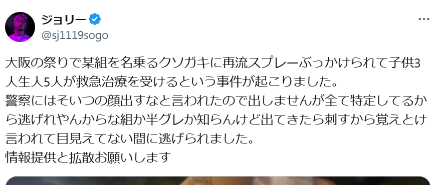 大阪の祭りで某組を名乗るクソガキに再流スプレーぶっかけられて子供3人生人5人が救急治療を受けるという事件が起こりました。… pic.twitter.com/c7iWy5ZxQw