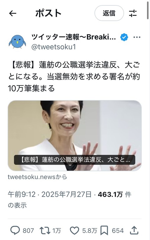 【悲報】蓮舫、公職選挙法違反が判明。当選無効を求める署名が10万筆集まる→500万人が注目wwwwwwww Twitter Facebook はてブ LINE コピー 2025.07.27 スポンサーリンク 1:それでも動く名無し:2025/07/27(日) 17:12:12.36 ID:80bCmupT0 2:それでも動く名無し:2025/07/27(日) 17:12:29.36 ID:80bCmupT0 選挙当日に「【れんほう】2枚目の投票用紙!」と言う名前で複数回投稿(公職選挙法違反) ↓ 選挙後に急いで消す 3:それでも動く名無し:2025/07/27(日) 17:14:22.16 ID:acVBFK8m0 公職選挙法なんて破ってなんぼだろ 警察もまともに相手せんしな 続きを読む