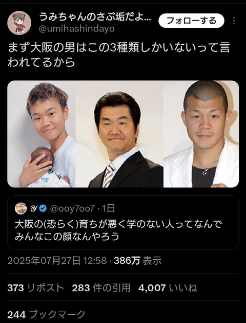【衝撃】大阪の男、わずか3種類しかいなかったwwww (※画像あり) Twitter Facebook はてブ LINE コピー 2025.07.27 スポンサーリンク 1:それでも動く名無し:2025/07/27(日) 18:45:38.61 ID:8Te47AAv0 2:それでも動く名無し:2025/07/27(日) 18:46:24.24 ID:Q5Bzn0PR0 1種類…ですよね? 3:それでも動く名無し:2025/07/27(日) 18:48:38.59 ID:Mf0NKRr60 ぶっさs 続きを読む