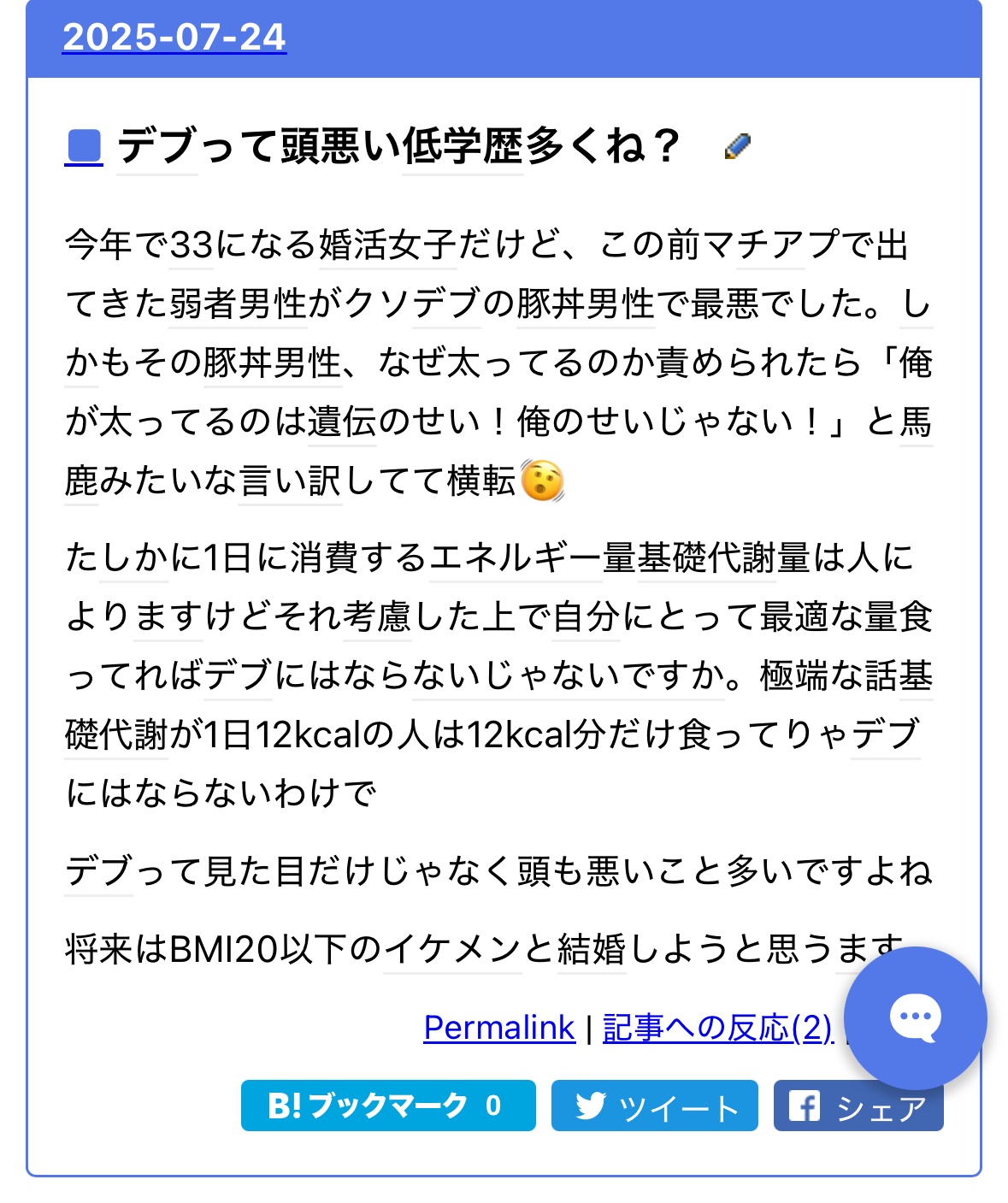 今年で33になる婚活女子だけど、この前マチアプで出てきた弱者男性がクソデブの豚丼男性で最悪でした。しかもその豚丼男性、なぜ太ってるのか責められたら「俺が太ってるのは遺伝のせい!俺のせいじゃない!」と馬鹿みたいな言い訳してて横転🫨