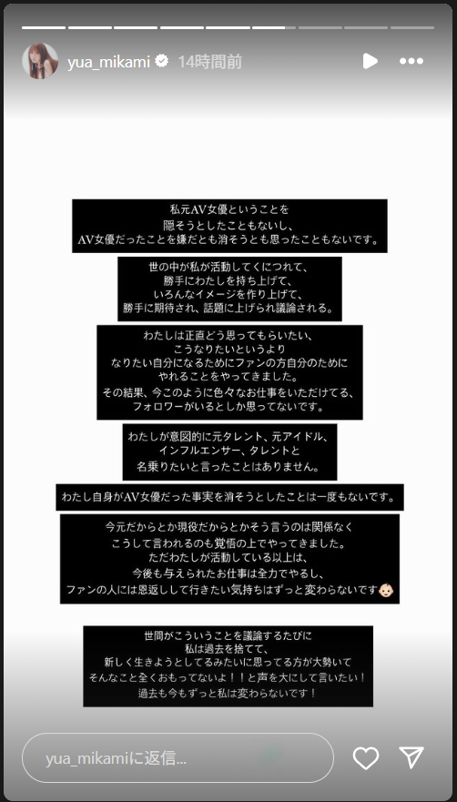 【SNS更新】三上悠亜、前職とドレスめぐる“炎上騒動”に思いつづる https://t.co/undefined 「こうして言われるのも覚悟の上でやってきました。ただ、活動している以上は、今後も与えられたお仕事は全力でやるし、ファンの人たちには恩返しして行きたい気持ちはずっと変わらないです」とつづった。