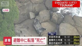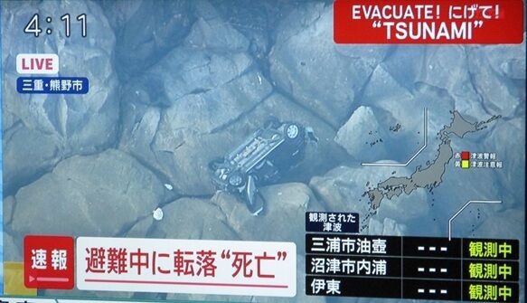 30日午前、三重県熊野市で津波警報の発表を受けて避難しようとしていた車が道路脇の崖下に転落し、運転していた女性が死亡しました。https://news.yahoo.co.jp/pickup/6547402